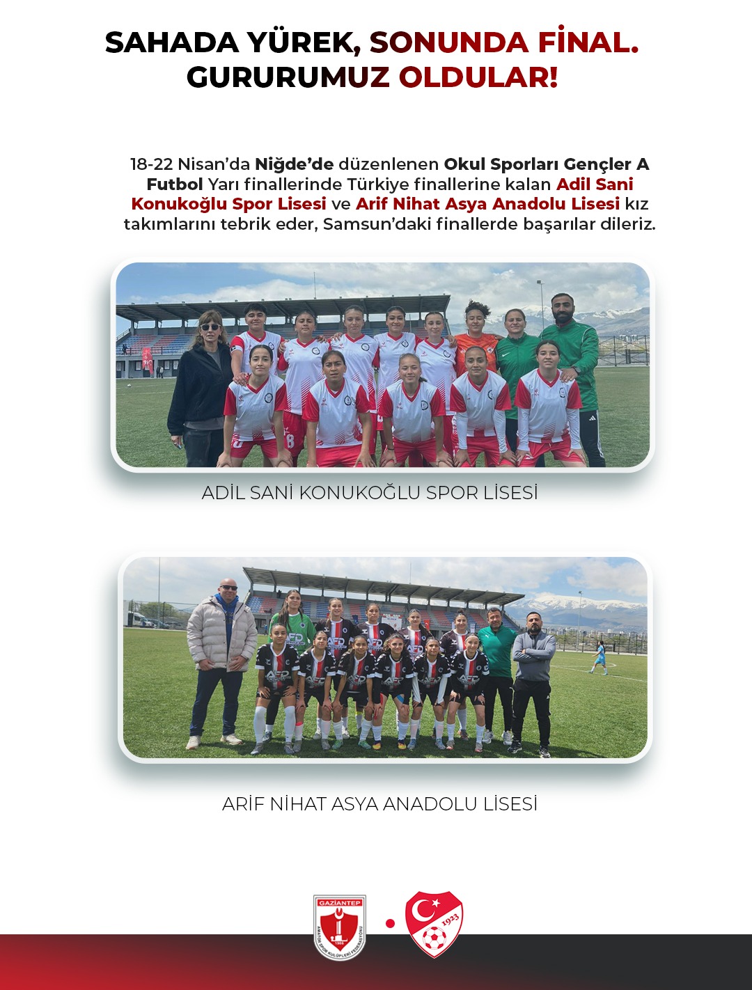 18-22 Nisan’da Niğde’de düzenlenen Okul Sporları Gençler A Futbol Yarı finallerinde Türkiye finallerine kalan Adil Sani Konukoğlu Spor Lisesi ve Arif Nihat Asya Anadolu Lisesi kız takımlarını tebrik eder, Samsun’daki finallerde başarılar dileriz.