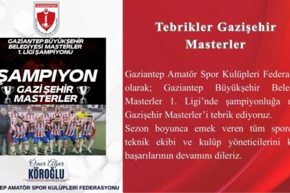 Gaziantep Amatör Spor Kulüpleri Federasyonu olarak; Gaziantep Büyükşehir Belediyesi Masterler 1. Ligi’nde şampiyonluğa ulaşan Gazişehir Masterler’i tebrik ediyoruz. Sezon boyunca emek veren tüm sporcu...