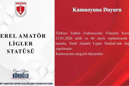 Türkiye Futbol Federasyonu Yönetim Kurulu’nun 21.01.2026 tarih ve 66 sayılı toplantısında alınan kararla, Yerel Amatör Ligler Statüsü’nde değişiklik yapılmıştır. Kamuoyuna saygıyla duyurulur. Gaziante...