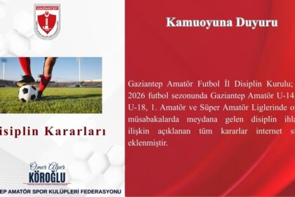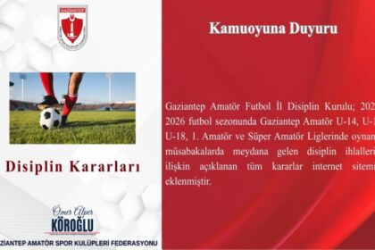 Gaziantep Amatör Futbol İl Disiplin Kurulu; 2025–2026 futbol sezonunda Gaziantep Amatör U-14, U-16, U-18, 1. Amatör ve Süper Amatör Liglerinde oynanan müsabakalarda meydana gelen disiplin ihlallerine ...