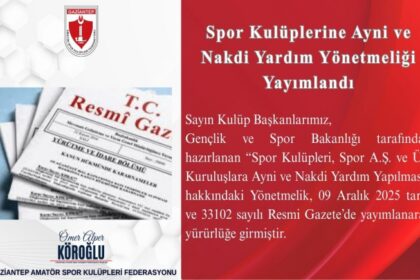 Sayın Kulüp Başkanlarımız, Gençlik ve Spor Bakanlığı tarafından hazırlanan “Spor Kulüpleri, Spor A.Ş. ve Üst Kuruluşlara Ayni ve Nakdi Yardım Yapılması” hakkındaki Yönetmelik, 09 Aralık...