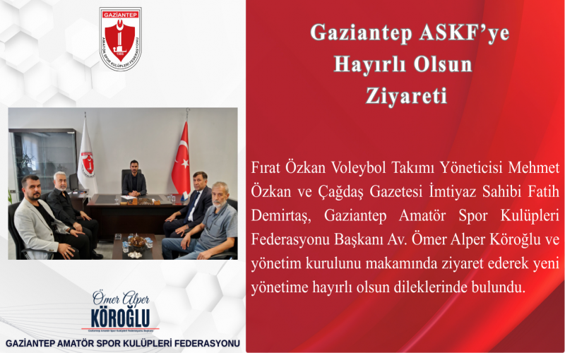 Fırat Özkan Voleybol Takımı Yöneticisi Mehmet Özkan ve Çağdaş Gazetesi İmtiyaz Sahibi Fatih Demirtaş, Gaziantep Amatör Spor Kulüpleri Federasyonu Başkanı Av. Ömer Alper Köroğlu ve yönetim kurulunu makamında ziyaret ederek yeni yönetime hayırlı olsun dileklerinde bulundu.