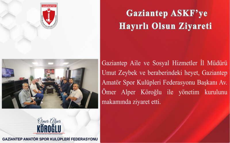 Gaziantep Aile ve Sosyal Hizmetler İl Müdürü Sn. Umut Zeybek ve beraberindeki heyet, Gaziantep Amatör Spor Kulüpleri Federasyonu Başkanı Av. Ömer Alper Köroğlu ile yönetim kurulunu makamında ziyaret etti.