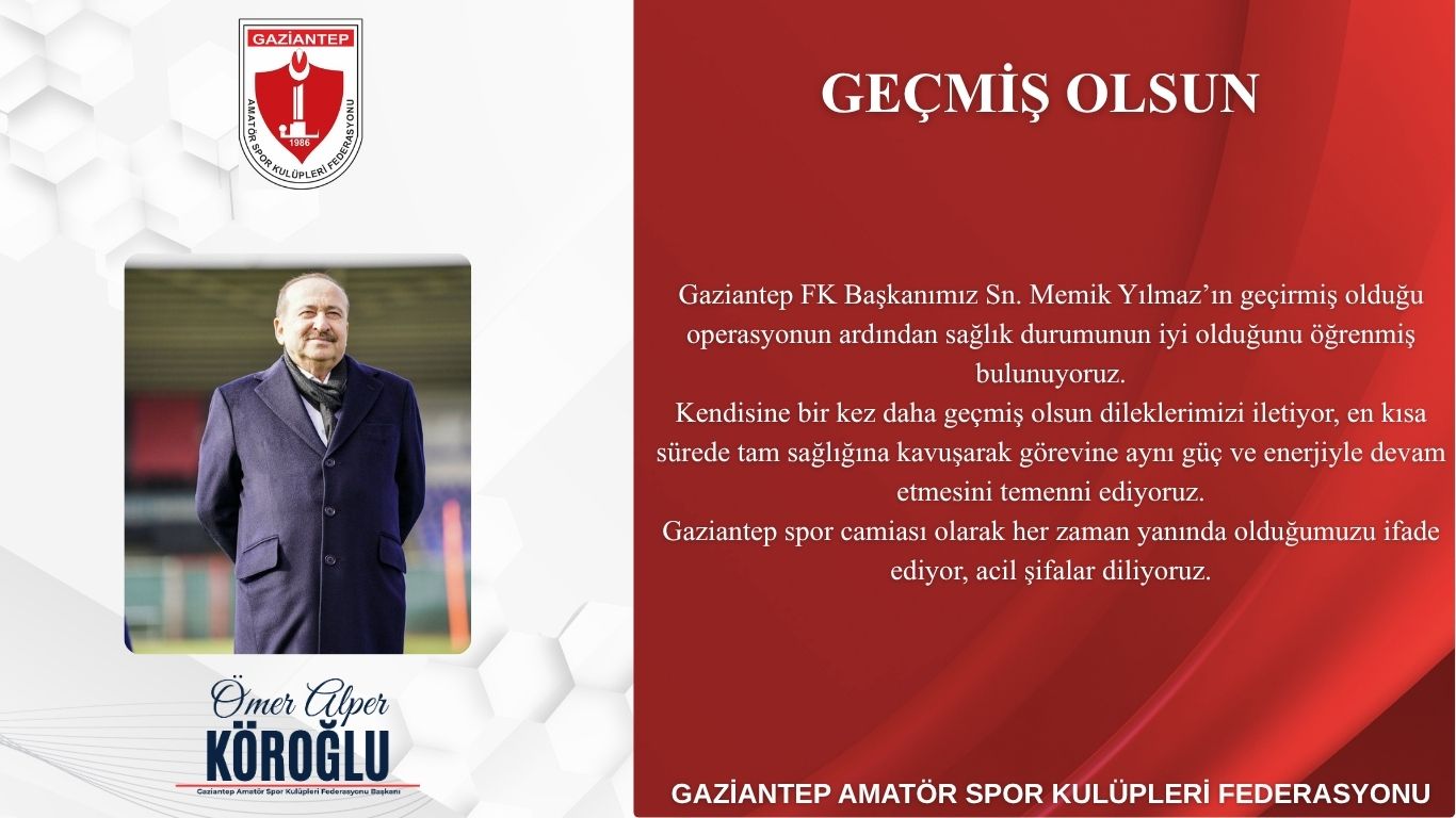 Gaziantep FK Başkanımız Sn. Memik Yılmaz’ın geçirmiş olduğu operasyonun ardından sağlık durumunun iyi olduğunu öğrenmiş bulunuyoruz.