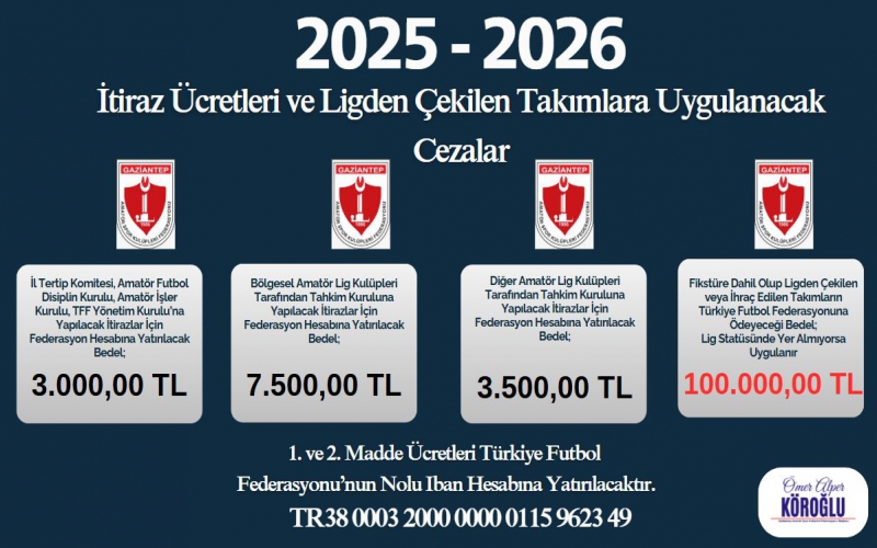 Türkiye Futbol Federasyonu (TFF), 2025-2026 sezonunda Amatör Liglerde uygulanacak itiraz ücretleri ile ligden çekilen veya ihraç edilen kulüplere verilecek cezaları açıkladı.