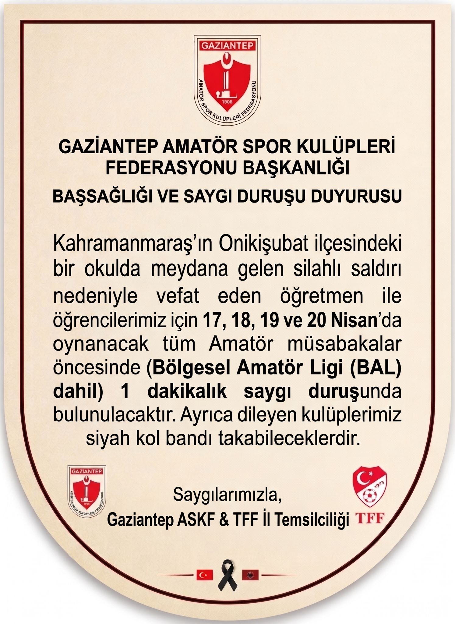 Kahramanmaraş’ın Onikişubat ilçesindeki bir okulda meydana gelen silahlı saldırı nedeniyle hayatını kaybeden öğretmenimiz ve öğrencilerimiz anısına, 17, 18, 19 ve 20 Nisan tarihlerinde oynanacak tüm amatör müsabakalar öncesinde, Bölgesel Amatör Lig karşılaşmaları dahil olmak üzere, 1 dakikalık saygı duruşunda bulunulacaktır.