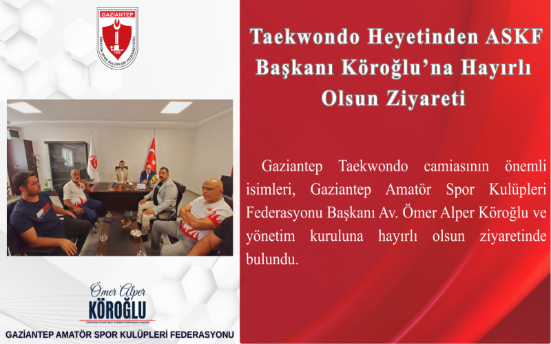 Gaziantep Taekwondo camiasının önemli isimleri, Gaziantep Amatör Spor Kulüpleri Federasyonu Başkanı Av. Ömer Alper Köroğlu ve yönetim kuruluna hayırlı olsun ziyaretinde bulundu.
