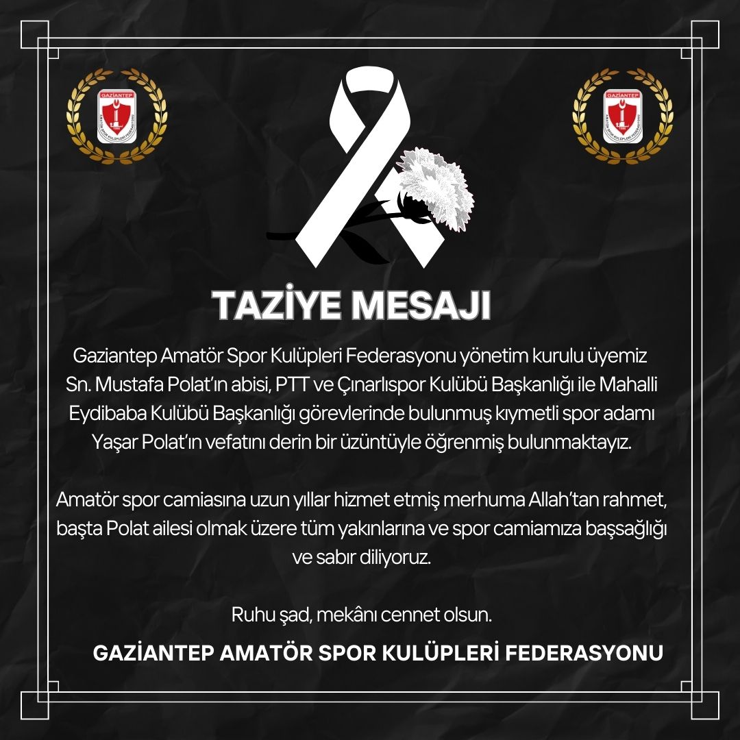 Gaziantep Amatör Spor Kulüpleri Federasyonu yönetim kurulu üyemiz Sn. Mustafa Polat’ın abisi, PTT ve Çınarlıspor Kulübü Başkanlığı ile Mahalli Eydibaba Kulübü Başkanlığı görevlerinde bulunmuş kıymetli spor adamı Yaşar Polat’ın vefatını derin bir üzüntüyle öğrenmiş bulunmaktayız.