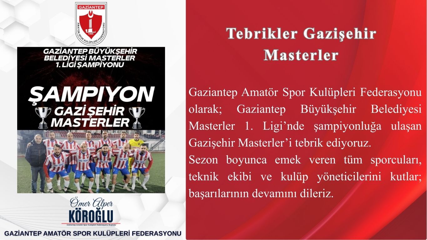 Gaziantep Amatör Spor Kulüpleri Federasyonu olarak; Gaziantep Büyükşehir Belediyesi Masterler 1. Ligi’nde şampiyonluğa ulaşan Gazişehir Masterler’i tebrik ediyoruz.